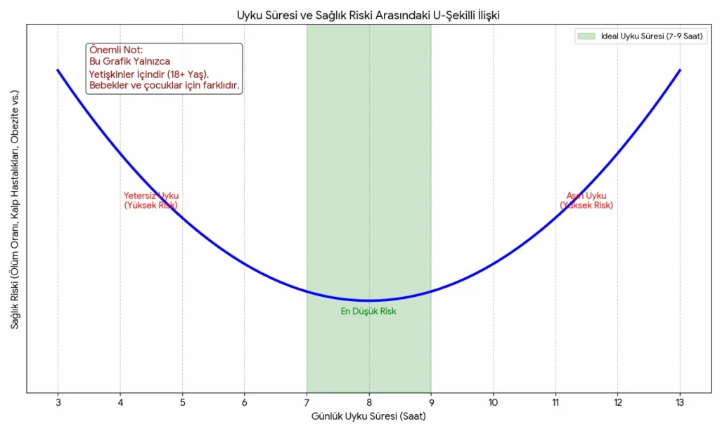 Uyku araştırmalarında sıkça görülen bulgulardan biri, uyku süresi ile sağlık riskleri arasında U-şekilli bir ilişki bulunmasıdır.