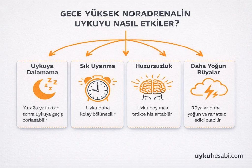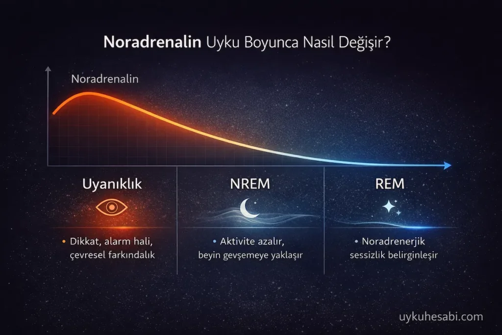 Noradrenalin gündüz dikkat, hazırlık ve hayatta kalma açısından gereklidir. Gece ise aynı sistemin fazla etkin veya yanlış zamanlanmış kalması, uykuya dalmayı zorlaştırabilir, gece uyanmalarını artırabilir, REM düzenini etkileyebilir ve sabah dinlenmemiş uyanmaya katkı sunabilir. Özellikle stres, travma, hiperarousal ve bazı ilaç kullanımlarında bu sistem daha görünür hale gelir.